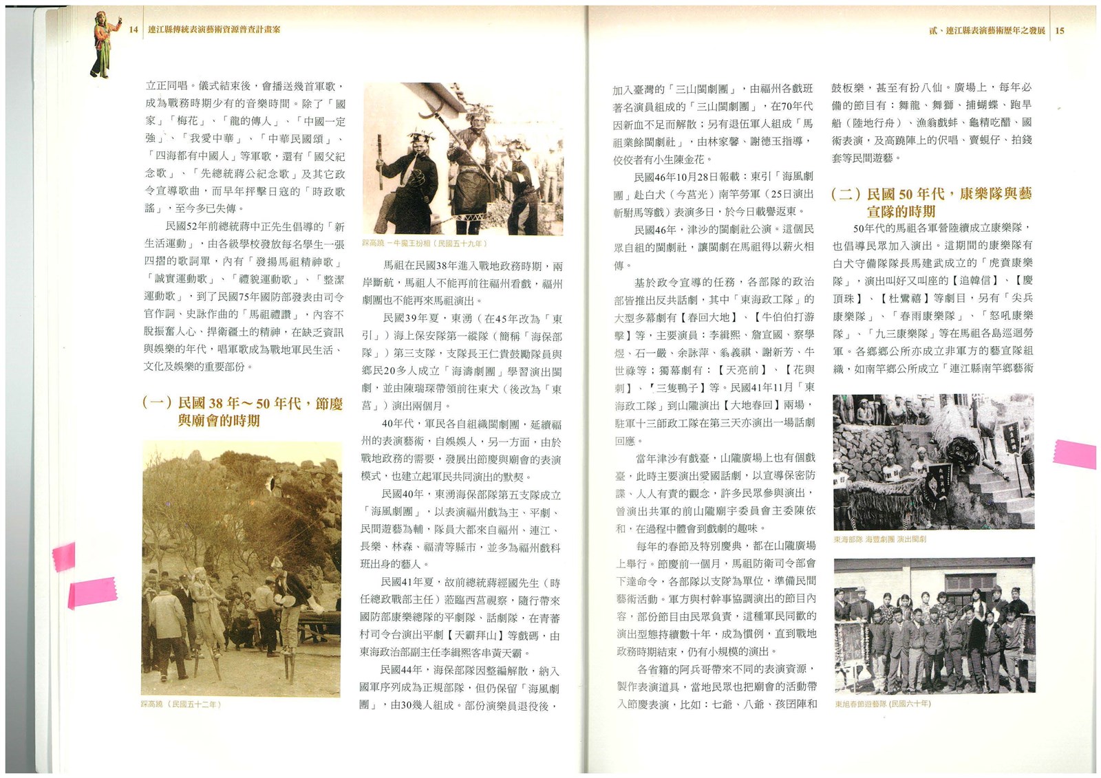 依據《連江縣傳統表演藝術資源普查計畫案》盤點表演藝術歷年發展,民國38年(1949)國軍戍守馬祖後,由於兩岸斷航,馬祖人不能再前往福州看戲,福州劇團也不能再來馬祖演出。民國39年夏,東湧(在民國45年改為「東引」)海上保安隊第一縱隊(簡稱「海保部隊」)第三支隊,支隊長王仁貴鼓勵隊員與鄉民20多人成立「海濤劇團」學習演出閩劇,並由陳瑞琛帶領前往東犬(後改為「東莒」)。40年代起,軍民各自組織閩劇團,延續福州的表演藝術,一方面自娛娛人,另方面,因應戰地政務的需要,逐漸發展出節慶與廟會的表演模式,也建立起軍民共同演出的默契。