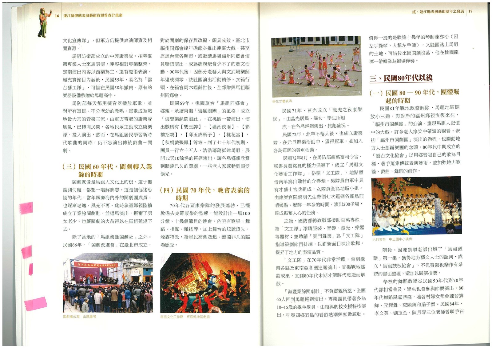 依據《連江縣傳統表演藝術資源普查計畫案》盤點表演藝術歷年發展,民國60年代為閩劇團轉入業餘的時期,除了當地的「馬祖業餘閩劇社」之外,旅台鄉親亦陸續成立業餘閩劇社並返馬祖演出。