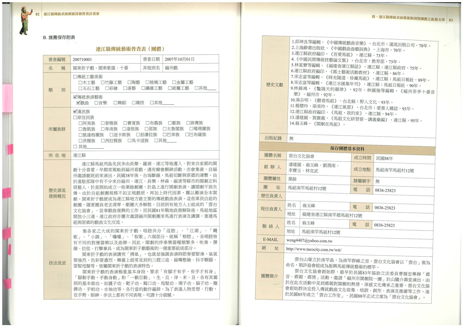 民國85年3月8日,「雲台工作室」成立,並於86年婦女節推出「三月的禮讚」,由地方婦女、學生演出地方曲藝「賣蟟囝」、「拍錢套」、「真鳥囝」、「月光光」等童謠,日漸式微的母語歌謠重現,令地方鄉親感動不已,此後「雲台工作室」便不斷協辦與福建的戲曲交流活動,同時也配合地方文化活動演出。民國87年「雲台工作室」為培訓地方閩劇人才,著手組團以「雲台樂府」為名,招募團員共33人,多為公教人員及婦女鄉親,利用閒暇之餘每周三、五夜間於馬祖村原天主教寶血幼稚園地,進行團練、研討聚會。