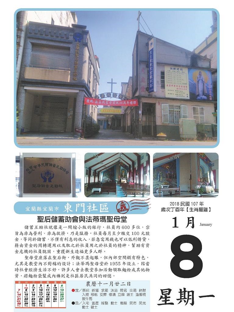 2018年社區日曆計包含:宜蘭市東門、梅洲、七張、進士、復興、擺厘;羅東鎮漢民、集祥里;蘇澳鎮福德;礁溪鄉大義、德陽;以及頭城鎮下埔等十二個社區,本月份是屬於東門社區的日曆。本篇1月8日的主題是「聖后儲蓄助會與法蒂瑪聖母堂」,屬於社區資源分類架構「人、文、地、景、產」的「文」類。其內容介紹『儲蓄互助社就像是一間縮小版的銀行,社員約600多位,宗旨為非為營利、非為救濟,乃是服務,社員每月至少繳交100元股金,等同於儲蓄,不僅有利息的收入,若急需用錢也可以低利借貸,藉由資金的周轉運用以及取之於社員用之於社員的精神,幫助有資金危機的社員脫困,重獲新生造福更多人群。 聖母堂座落在聖后街,外觀不甚起眼,但內部空間頗有特色,尤其是教堂內不對稱的設計;法蒂瑪聖母堂於1955年設立,因當時社會經濟生活不好,許多人會去教堂參加活動領取麵粉或其他物資,將麵粉袋製成內褲則是社區居民共同的回憶。』