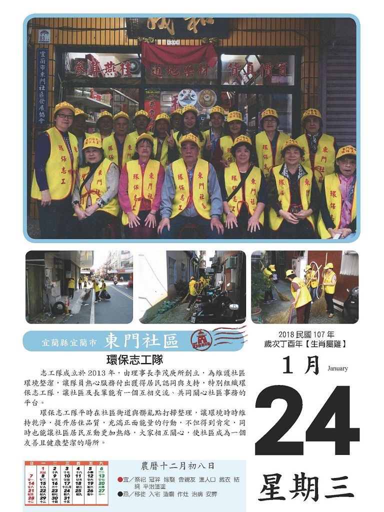 2018年社區日曆計包含:宜蘭市東門、梅洲、七張、進士、復興、擺厘;羅東鎮漢民、集祥里;蘇澳鎮福德;礁溪鄉大義、德陽;以及頭城鎮下埔等十二個社區,本月份是屬於東門社區的日曆。本篇1月24日的主題是「環保志工隊」,屬於社區資源分類架構「人、文、地、景、產」的「人」類。其內容介紹『志工隊成立於2013年,由理事長李茂庚所創立,為維護社區環境整潔,讓隊員熱心服務付出獲得居民認同與支持,特別組織環保志工隊,讓社區及長輩能有一個互相交流、共同關心社區事務的平台。 環保志工隊平時在社區街道與髒亂點打掃整理,讓環境時時維持乾淨,提升居住品質,充滿正面能量的行動,不但得到肯定,同時也能讓社區居民互動更加熱絡,大家相互關心,使社區成為一個友善且健康整潔的場所。』