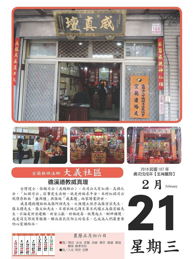 2018年社區日曆計包含:宜蘭市東門、梅洲、七張、進士、復興、擺厘;羅東鎮漢民、集祥里;蘇澳鎮福德;礁溪鄉大義、德陽;以及頭城鎮下埔等十二個社區,本月份是屬於大義社區的日曆。本篇2月21日的主題是「礁溪道教威真壇」,屬於社區資源分類架構「人、文、地、景、產」的「文」類。其內容介紹『台灣道士,俗稱司公(或稱師公)。而司公又有紅頭、烏頭之分,「紅頭司公」從事度生法術,就是祈福求平安。本村紅頭司公現僅存林姓「盛興壇」與張姓「威真壇」兩家開業濟世。威真壇創壇始祖為張阿頭先生,之後壇主依序為張塗宗先生、張玉標先生、張文松先生,目前衣缽已傳至第五代壇主為張宏銘先生,不論是祈安建醮、祈安三獻、祈福延壽、收驚起土、酬神補運、或是消災祭改等服務,解決居民信仰上的需求,已成為人們最重要的心靈補給站。』