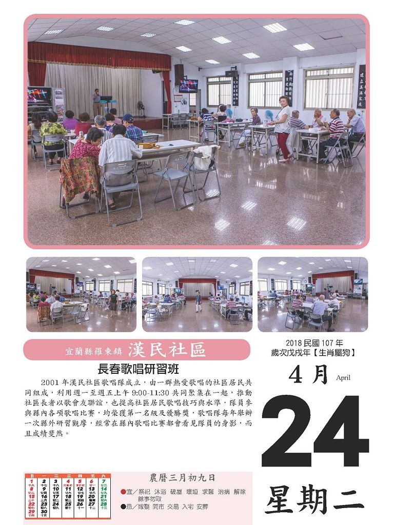 2018年社區日曆計包含:宜蘭市東門、梅洲、七張、進士、復興、擺厘;羅東鎮漢民、集祥里;蘇澳鎮福德;礁溪鄉大義、德陽;以及頭城鎮下埔等十二個社區,本月份是屬於漢民社區的日曆。本篇四月二十四日的主題是「長春歌唱研習班」,屬於社區資源分類架構「人、文、地、景、產」的「文」類。其內容介紹『2001年漢民社區的歌唱隊成立,由一群熱愛歌唱的社區居民共同組成,利用每週一至週五上午9:00-11:30共同聚集在一起,推動社區長者以歌會友聯誼,也提高社區居民歌唱技巧與水準,隊員參與縣內各項歌唱比賽,均榮獲第一名級及優勝獎,歌唱隊每年舉辦 一次縣外研習觀摩,經常在縣內歌唱比賽都會看見隊員的身影,而且成績斐然。』