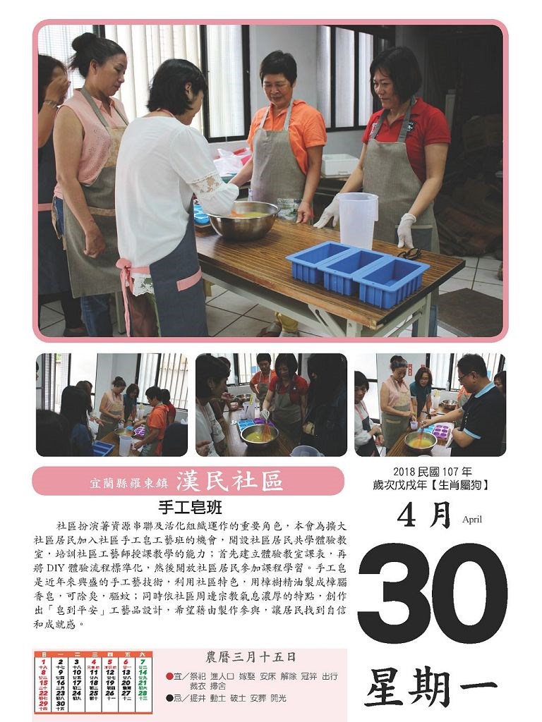 2018年社區日曆計包含:宜蘭市東門、梅洲、七張、進士、復興、擺厘;羅東鎮漢民、集祥里;蘇澳鎮福德;礁溪鄉大義、德陽;以及頭城鎮下埔等十二個社區,本月份是屬於漢民社區的日曆。本篇四月三十日的主題是「手工皂班」,屬於社區資源分類架構「人、文、地、景、產」的「文」類。其內容介紹『社區扮演著資源串聯及活化組織運作的重要角色,本會為擴大社區居民加入社區手工皂工藝班的機會,開設社區居民共學體驗教室,培訓社區工藝師授課教學的能力;首先建立體驗教室課表,再將DIY體驗流程標準化,然後開放社區居民參加課程學習。手工皂是近年來興盛的手工藝技術,利用社區特色,用樟樹精油製成樟腦香皂,可除臭,驅蚊;同時依社區周邊宗教氣息濃厚的特點,創作出「皂到平安」工藝品設計,希望藉由製作參與,讓居民找到自信和成就感。』