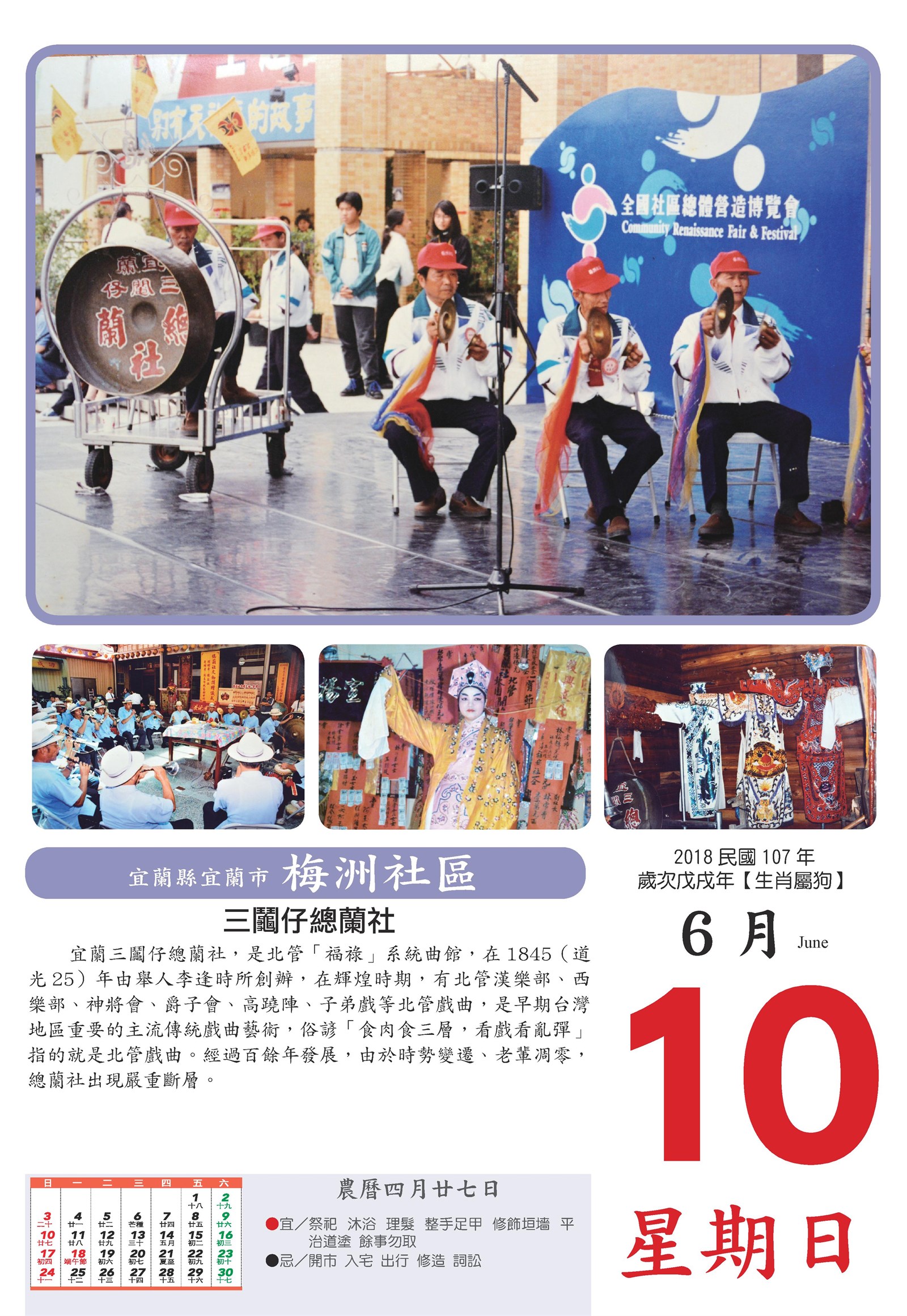 2018年社區日曆計包含:宜蘭市東門、梅洲、七張、進士、復興、擺厘;羅東鎮漢民、集祥里;蘇澳鎮福德;礁溪鄉大義、德陽;以及頭城鎮下埔等十二個社區,本月份是屬於梅洲社區的日曆。本篇六月十日的主題是「三鬮仔總蘭社」,屬於社區資源分類架構「人、文、地、景、產」的「文」類。其內容介紹『宜蘭三鬮仔總蘭社,是北管「福祿」系統曲館,在1845(道光25)年由舉人李逢時所創辦,在輝煌時期,有北管漢樂部、西樂部、神將會、爵子會、高蹺陣、子弟戲等北管戲曲,是早期台灣地區重要的主流傳統戲曲藝術,俗諺「食肉食三層,看戲看亂彈」指的就是北管戲曲。經過百餘年發展,由於時勢變遷、老輩凋零,總蘭社出現嚴重斷層。』