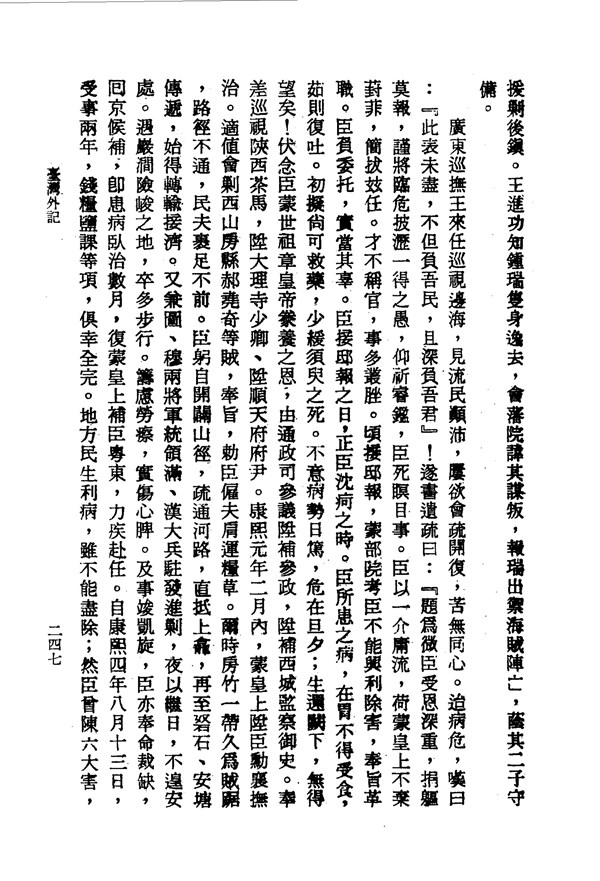 廣東巡撫王來任自陳胃不得受食,茹則復吐之病勢 臺灣外記卷六 台灣文獻史料叢刊 -