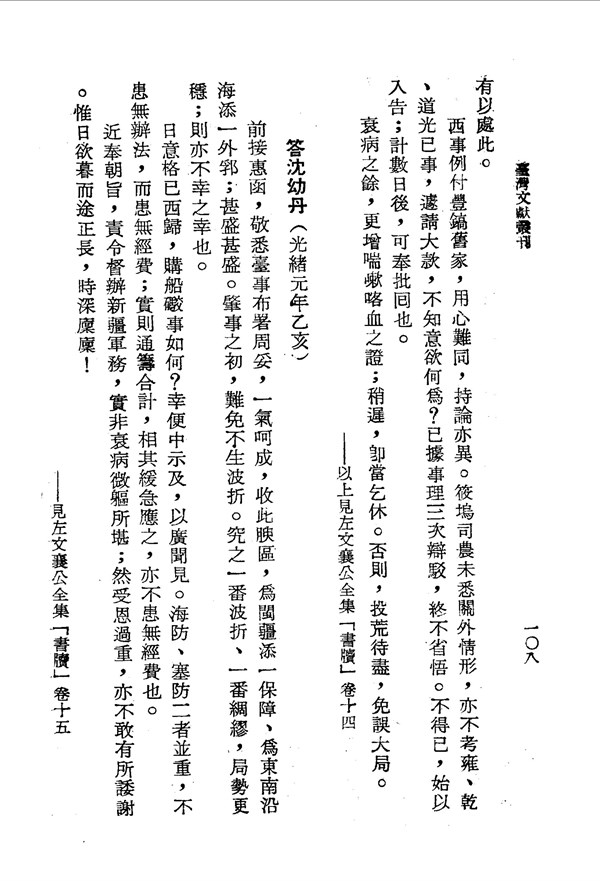 左宗棠因衰病之軀,加以水土不服,請求回籍調理。 左文襄公奏牘卷一 台灣文獻史料叢刊 -