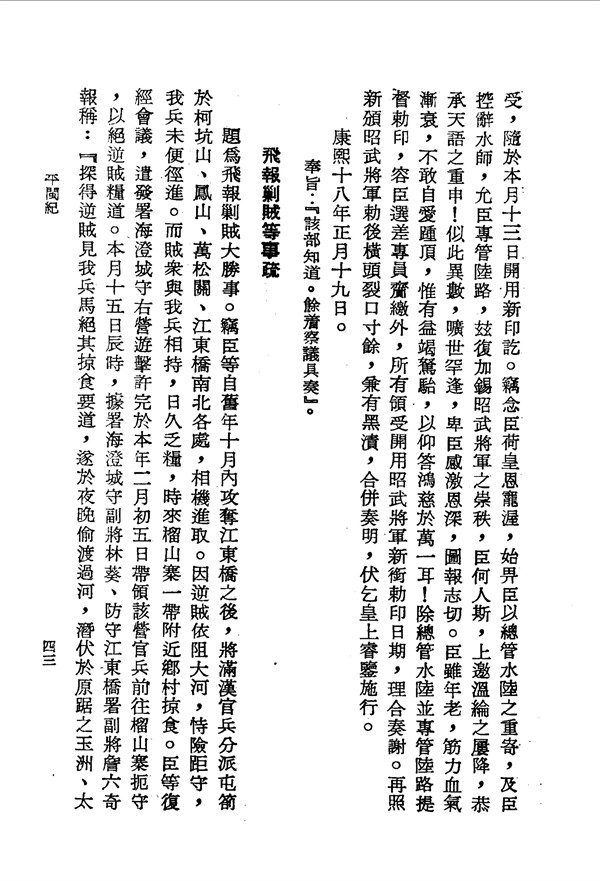 楊捷感謝皇上念其年老有疾與閩地濕熱,調補江南 平閩紀卷之三 台灣文獻史料叢刊 -