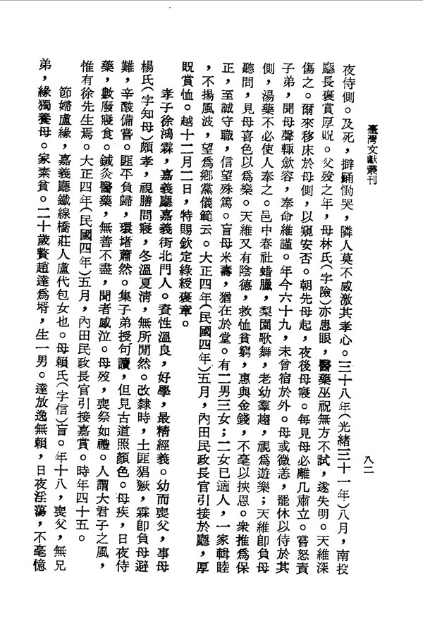 廖天維其母林氏得到眼病,醫藥巫祝無效而失明,其後隨侍在側不離身 彰化節孝冊附錄 台灣文獻史料叢刊 -