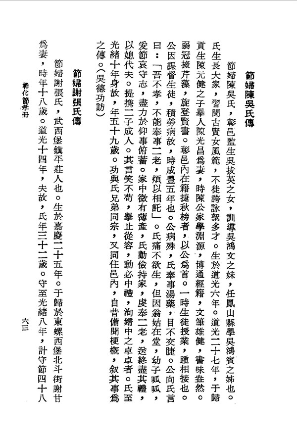 陳吳氏其夫積勞病故,奉事湯藥不懈 彰化節孝冊 台灣文獻史料叢刊 -
