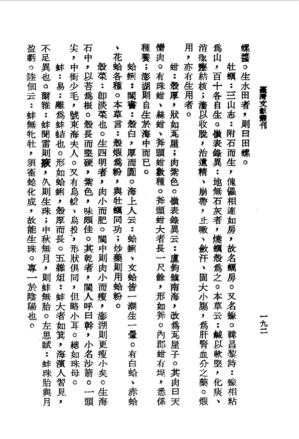 蛤蜊之殼煆為粉,與牡蠣同功,炒藥則用蛤粉 澎湖紀略卷之八 台灣文獻史料叢刊 -