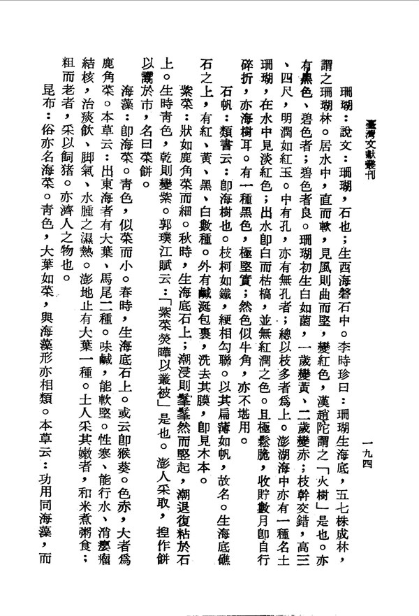 海藻即海菜,性寒能行水,消癭瘤結核,可治痰飲、腳氣、水腫之濕熱 澎湖紀略卷之八 台灣文獻史料叢刊 -