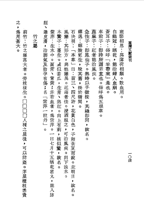蛇草,煎泡酒服,蛇傷則癒 鳳山縣志卷之七 台灣文獻史料叢刊 -