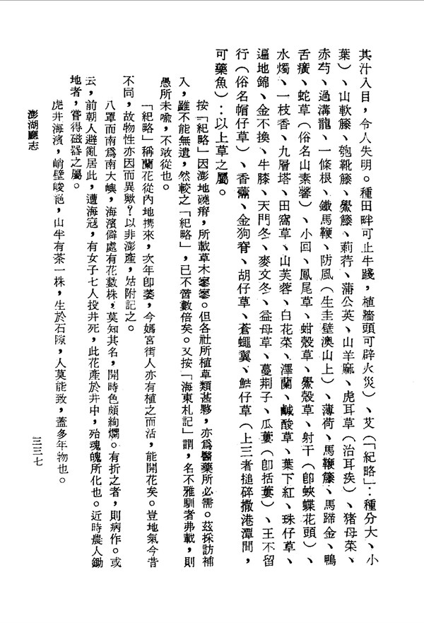豬母菜、赤芍、過溝龍、一條根、鐵馬鞭、防風 澎湖廳志卷十 台灣文獻史料叢刊 -