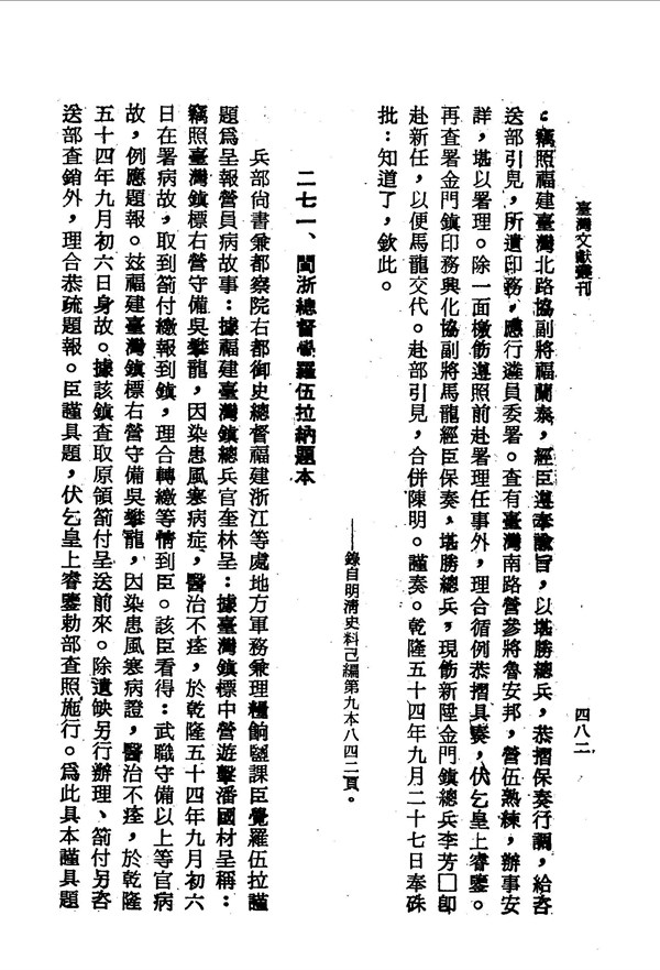 吳攀龍感染風寒而死亡 臺案彙錄乙集卷五 台灣文獻史料叢刊 -