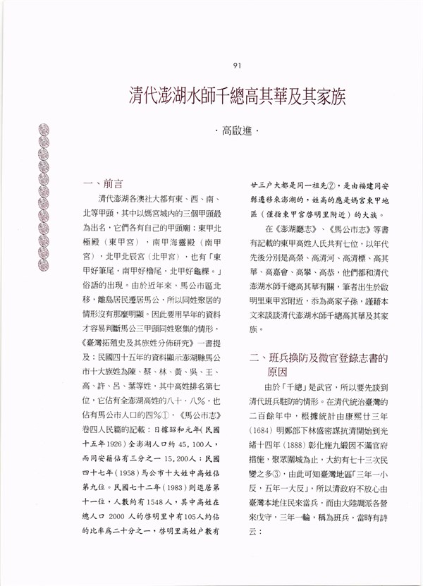 《西瀛風物》創刊號〈清代澎湖水師千總高其華及其家族〉 -