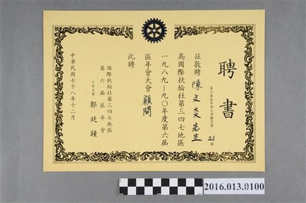 陳文炎任國際扶輪社第三四七地區1989-90年度第六屆區年會大會顧問之聘書 -