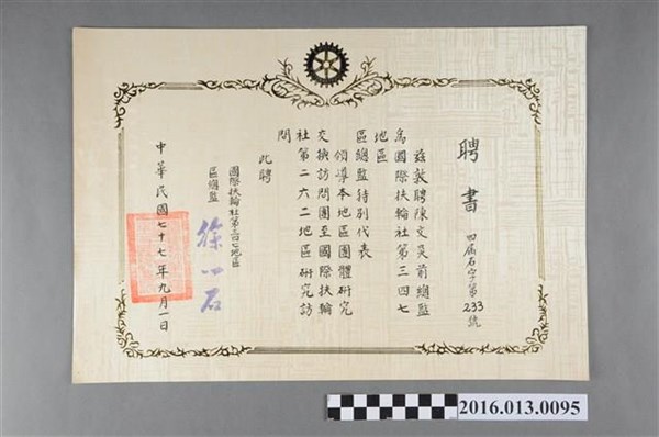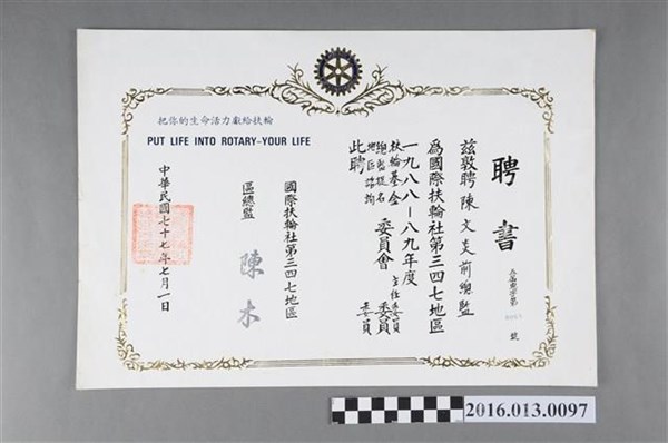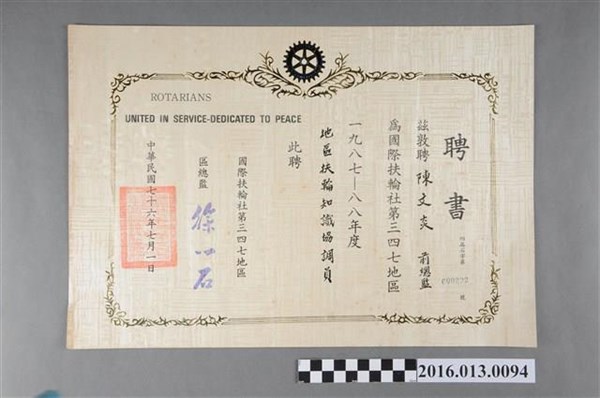 陳文炎任國際扶輪社第三四七地區1987-88年度地區扶輪知識協調員之聘書 -