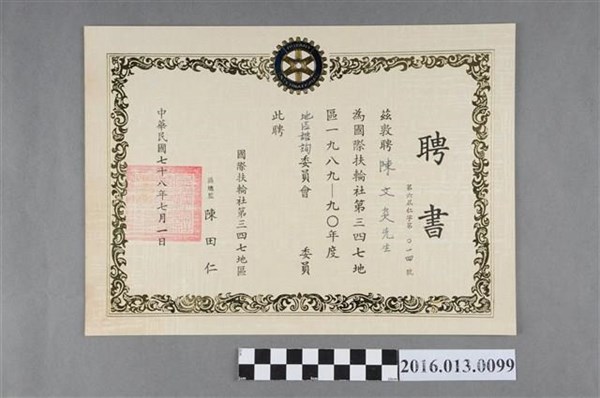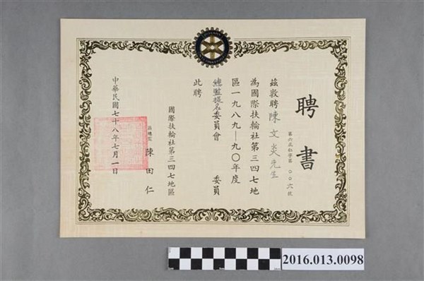陳文炎任國際扶輪社第三四七地區1989-90年度地區諮詢委員會委員之聘書 -