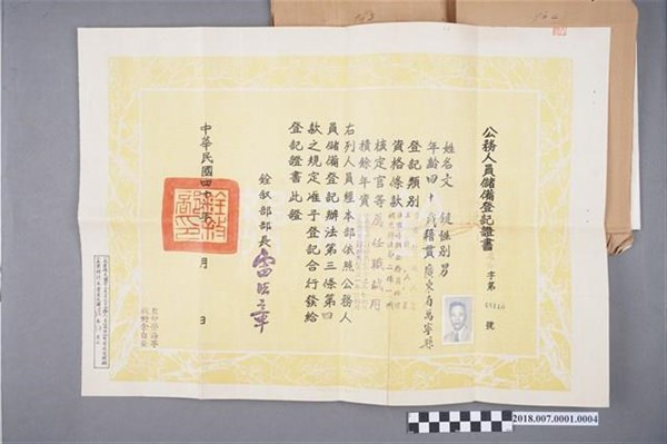文鍵任陸軍第六十五軍軍需處糧秣課三等軍需正軍需之軍政部委任令 -