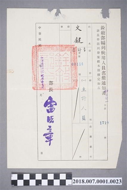文鍵任臺中高級家事商業職業學校主計室主任之臺灣省政府主計處任免人員通知書 -