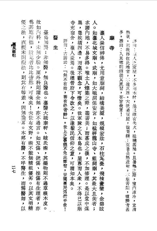 昔臺灣醫者多用軒、岐氏術,今日則汲取西洋醫術,並設醫院於各地 臺風雜記 台灣文獻史料叢刊 -