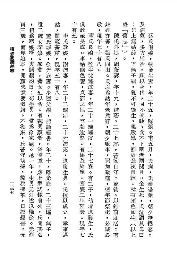 蔡氏偕娘照顧生病的張金生,金生死後自盡 續修臺灣縣志卷三 台灣文獻史料叢刊
