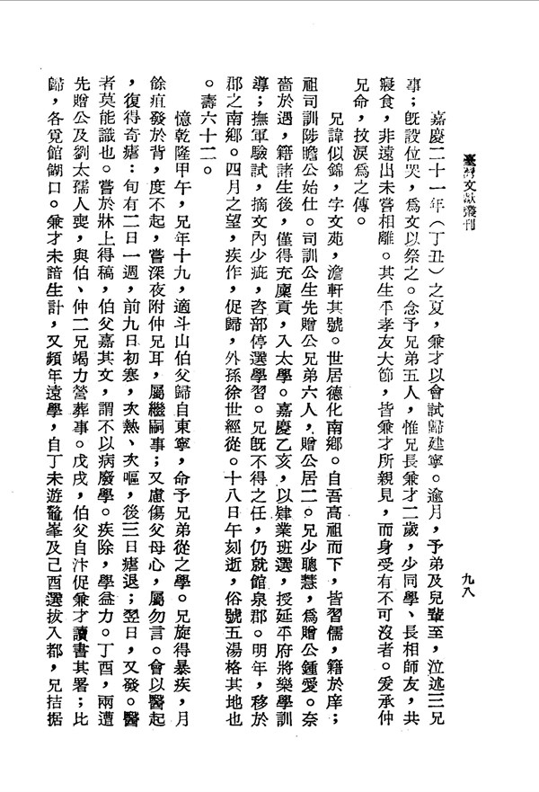 哥哥背部疽病發作,其後又得瘧疾,難以醫治 六亭文選雜著卷二 台灣文獻史料叢刊 -
