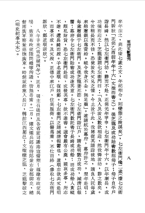 七左衛門欲共父赴明不成,以醫為業不仕而終 臺灣鄭氏紀事卷之上 台灣文獻史料叢刊