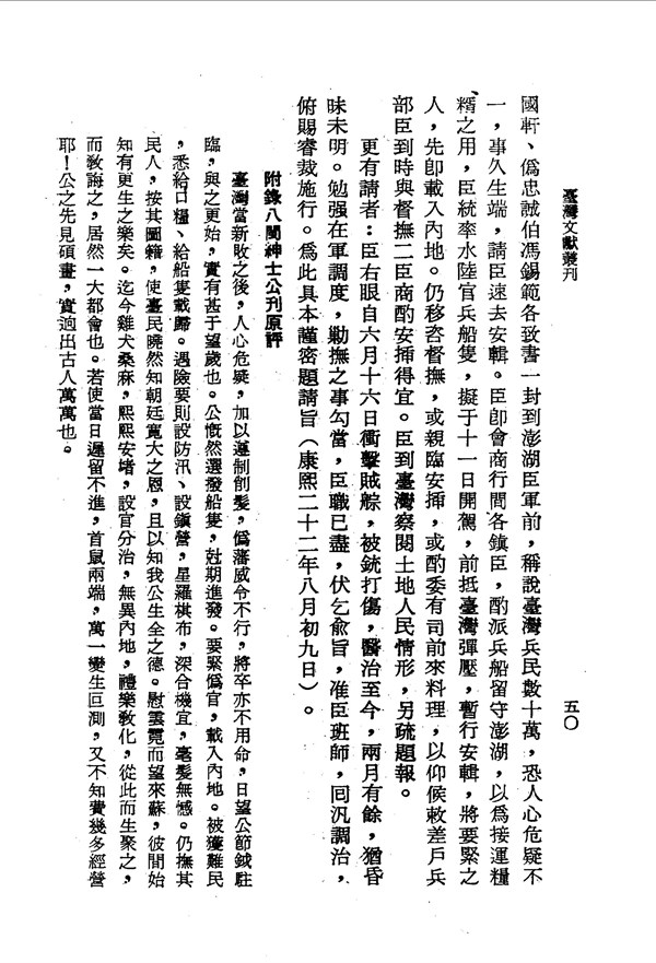 臣右眼重傷,乞俞旨准臣回汎調治 靖海紀事下卷 台灣文獻史料叢刊 -
