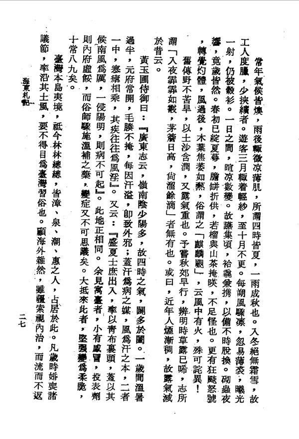 嶺南陰少陽多風淫,台地正相同 海東札記卷三 台灣文獻史料叢刊 -