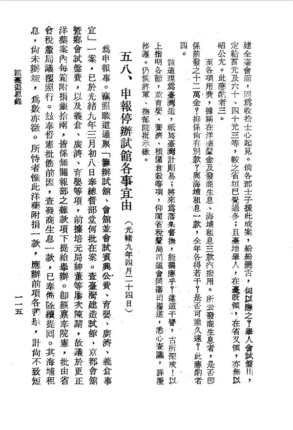 紳董多次申請建造台灣地方,決議每箱洋藥捐銀給予舉辦 巡臺退思錄卷二 台灣文獻史料叢刊 -