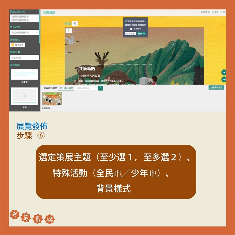 - 展覽主題及策展理念:展覽主題呈現地方特色並具代表性、議題選定具獨特創意、展覽核心概念清楚、有效傳遞「共築島語」策展理念等。