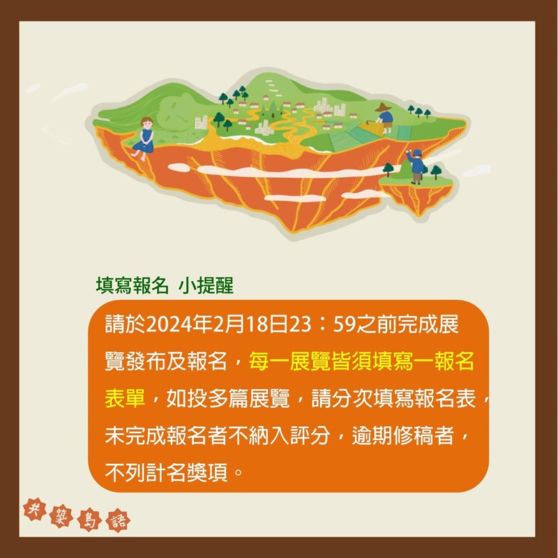 本次徵件以「地方」出發,邀請所有對「地方」有興趣的朋友們,一起探索地方社區的人.文.地.產.景,透過文字的採集、創意的策展,以及展品的表現,將每個地方的記憶交織成獨特的島嶼語言。一起在「共築島語」的旅程中,用心共建屬於臺灣的文化故事。