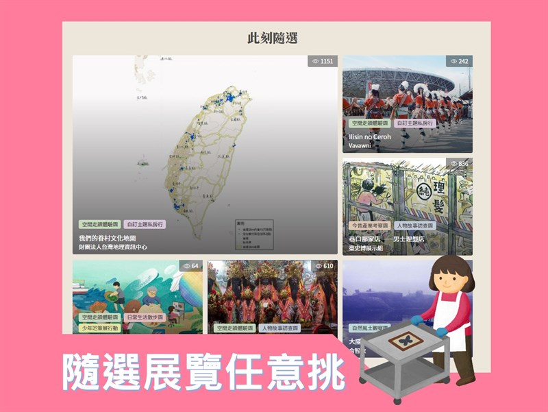 如同串流平臺隨選隨看,首頁「此刻隨選」,讓民眾每次逛網站都能看到不同展覽,不僅適合用來找靈感,也讓民眾已經完成的展覽有機會被隨機推送至首頁,增加每個展覽的瀏覽率。