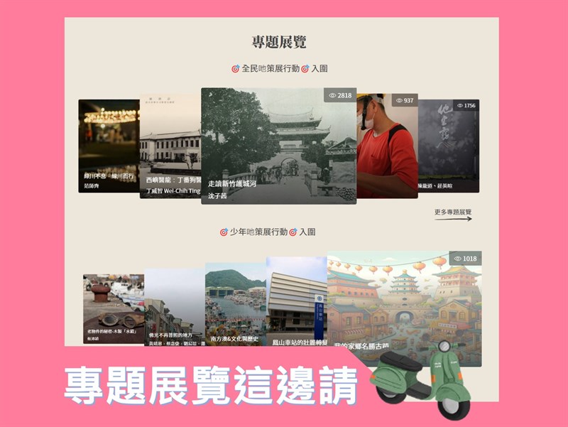 首頁「專題展覽」將不定期呈現網站展覽活動,讓民眾一覽無遺瀏覽專題展覽。例如2023-2024年,以「地方」為主題的策展徵件,我們收到從全國各地百餘件線上展覽,最終擇選出26件入圍作品,每一件作品都有其優質之處,因此專題展覽特地呈現入圍作品,邀請民眾共賞佳作。