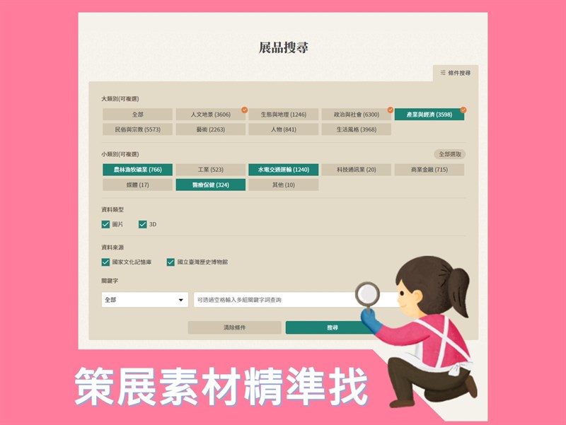 本網站設計,策展過程除了自行拍攝照片上傳,也可利用網站既有資源。這一次我們在展品搜尋介面,擴充了跨大小類別複選、關鍵字搜尋、透過資料來源搜尋等搜尋功能,幫助策展人更有效率找到所需資料。