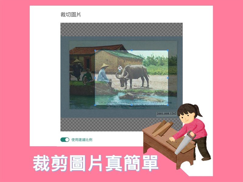 每檔展覽的展品呈現總是獨一無二,為了讓展品素材的瀏覽畫面符合個別展示需求,「線上裁切圖片」功能讓策展人能一邊製做展覽、一邊裁剪圖片。同時還有建議的圖片呈現比例,讓展覽呈現效果更加順暢。