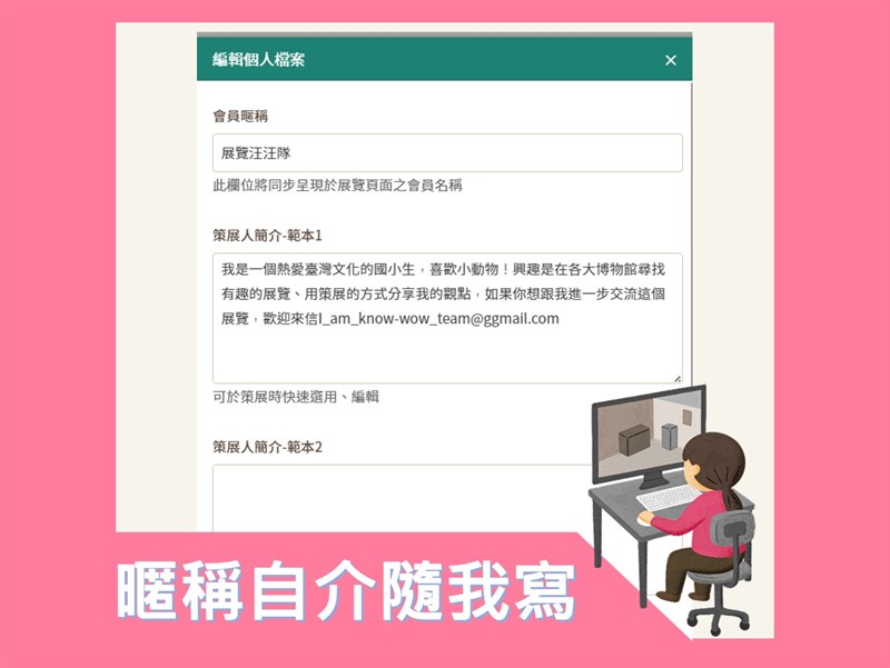在眼花撩亂的數位世界,留下令人印象深刻的暱稱和個人介紹至關重要。為了滿足此需求,我們新增「策展人暱稱與個人簡介草稿」功能。這不僅考慮到個人隱私,使策展人的真實姓名不會直接顯示在網站上,還可以設定暱稱並撰寫自我介紹。在策展過程中,策展人可以直接選用已設定的自我介紹版本、省去每次重新思考、繕打的時間,提升便利性,同時亦有助策展人建立展覽的個人品牌。