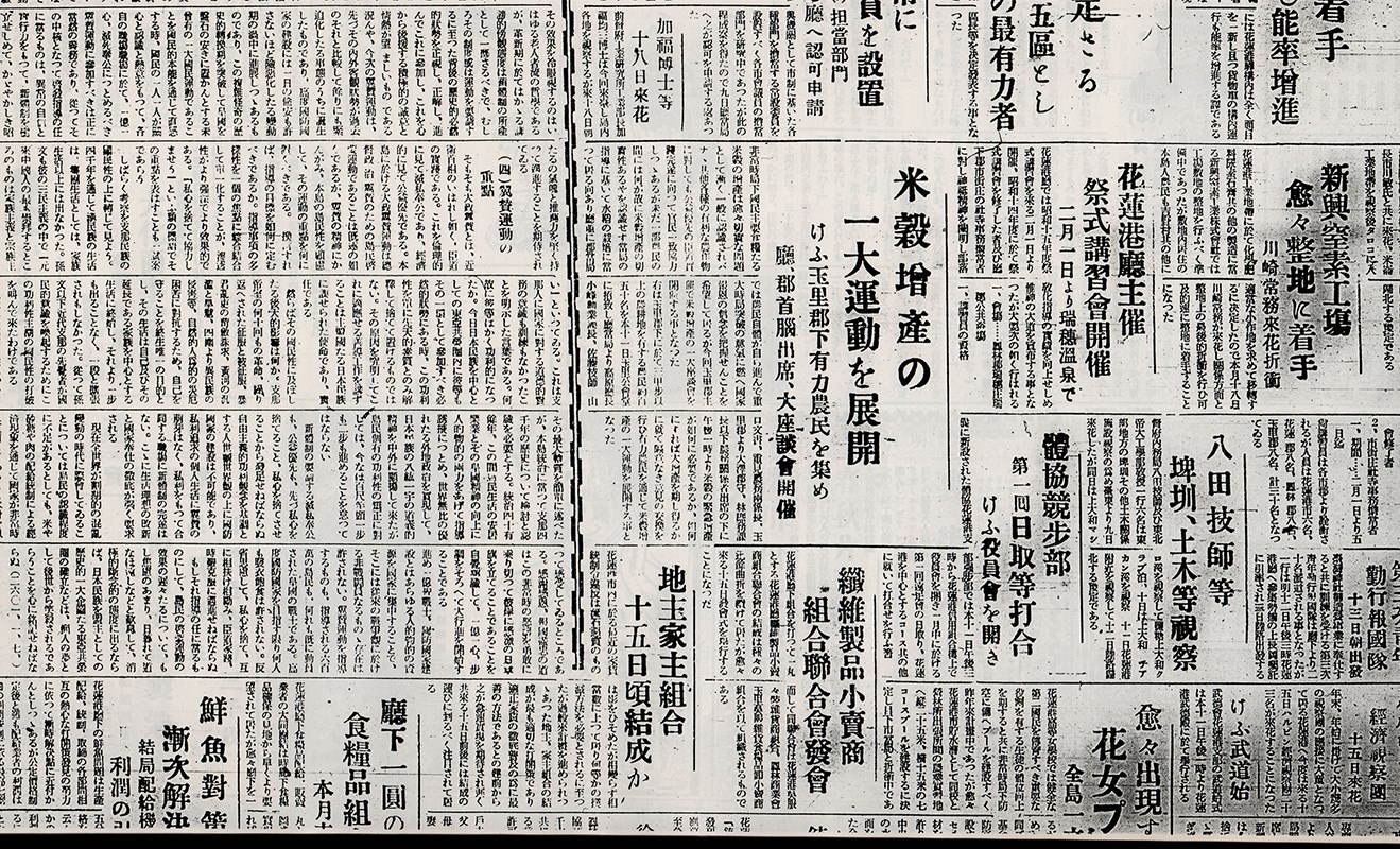 此報紙影像為1941年(昭和16年)1月11日東臺灣新報地方版的報導,說明當時總督府八田與一技師與東北帝大工學部教授一行人6名,從9日起到花蓮港廳視察埤圳、土木工程的行程。第一天一行人先至上大和的mashiro溪視察鹽糖上大和的kurapu湖泊,第二天的行程到上大和的chiakan溪視察,11日當天至花蓮港,並預定在12日經由陸路回到北部。1941年(昭和16年)是花蓮港市從花蓮港街升格為市的隔年,也是花蓮築港完成後朝工業化城市快速轉型的階段。東臺灣新報是花東地區最早的地方報社,從地方新聞版面可窺見有別於全國性報紙的在地生活及社會樣貌;透過解讀其地方產業資訊及廣告,更是了解日治後期東臺灣地方發展的重要報導史料。此影像翻拍自東臺灣研究會的複印本,以中文摘錄日文報導標題及內文重點。