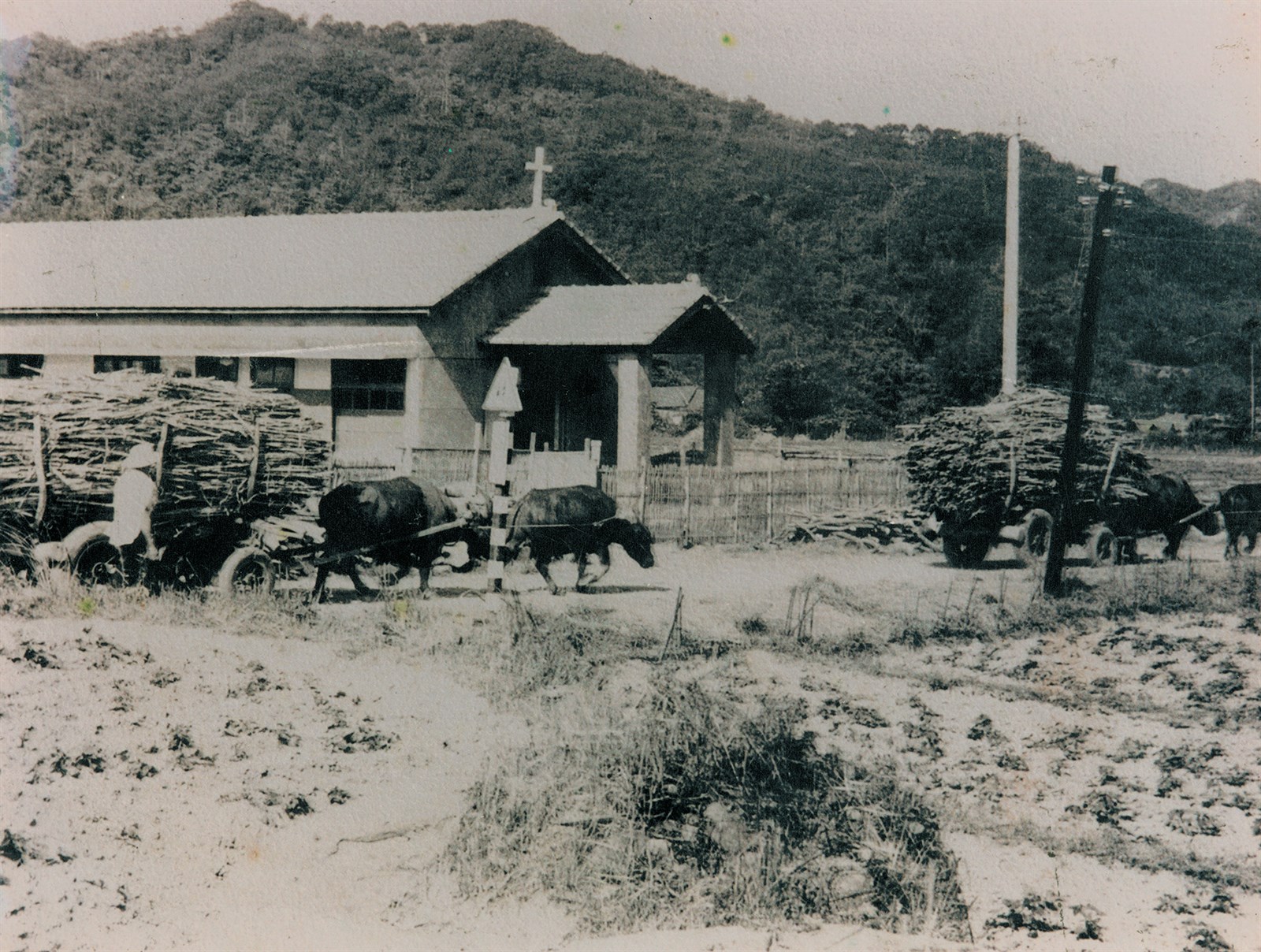 載運甘蔗的牛車照片由德裔美籍神父謝省躬(Robert Russell Sprinkle, 1906-2003)神父於1960年代所拍攝,地點位在南投縣鹿谷鄉秀峰村。照片主體為行經秀峰天主堂前托運甘蔗的牛車,此牛車所運送的是成堆的白甘蔗,相對於食用的紅甘蔗,白甘蔗是用於製作糖的原料,採收後需送至糖廍加工。而清水溝地區地形崎嶇加上貨物沈重,因此需使用兩隻牛來共同拖曳拉車方有足夠的動力,當地人俗稱這種牛車為「雙抽牛車」。牛車後方的建築物為秀峰天主堂,是長型的混凝土牆、木構屋頂之平房建築,屋頂架有十字架。