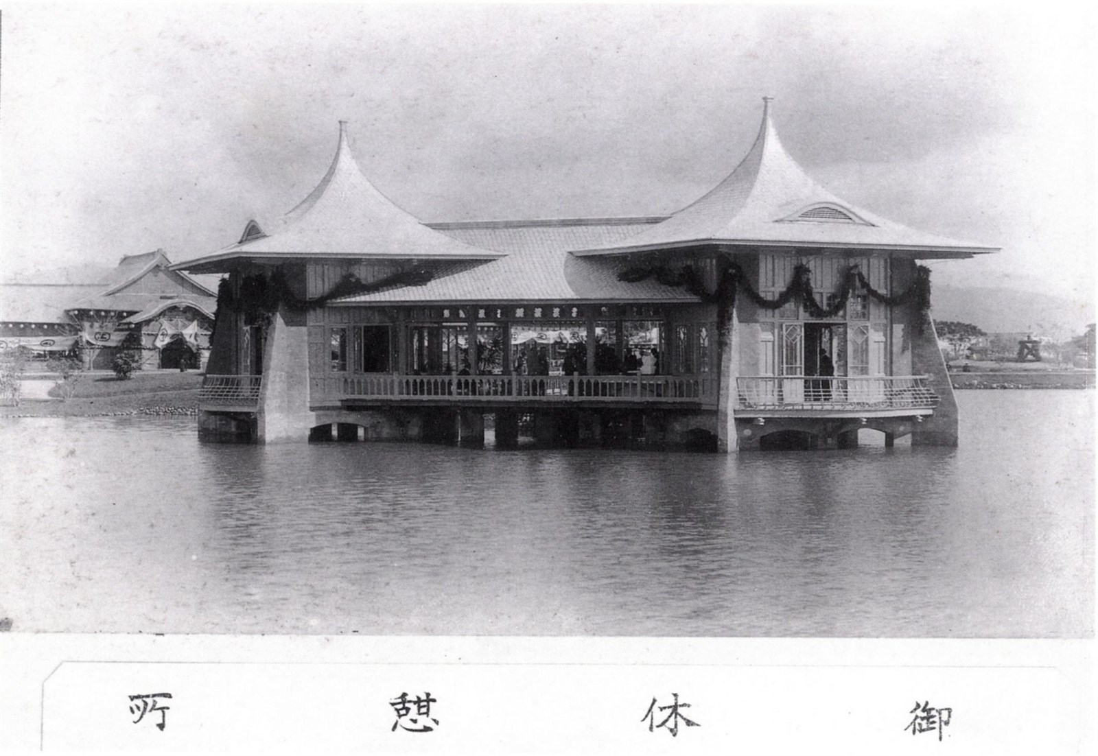臺中公園的池亭,明治41(1908)年10月24日在公園舉行臺灣縱貫鐵路通車慶祝會時,為閑院宮載仁親王之休息處,今已成為臺中市之地標。 出自《台中市珍貴古老照片專輯第四集》,2000年12月出版,為保留照片的純樸風味,本專輯不作多餘的贅飾,僅將徵集評選出來的古老照片翻拍並分類編排,計分:人物與服飾篇、教育篇、建物與景勝篇、市街與交通篇、生活篇等五個篇章,盡量呈現古照片的原始風貌,讓讀者得以細細玩味舊時代的生活情趣。 日治時代1905年5月,第一代臺中車站建立,名為「臺中停車場」,是棟L型木造車站,首任站長塚澤力太郎。1908年4月,興建火車站機關庫,乃一雙坡斜頂紅磚建築,設三個維修蒸汽車的車道。 1908年10月24日,日本閑苑宮載仁親王來臺主持臺灣縱貫鐵道全通式,臺中公園內的湖心亭即為慶祝鐵道開通所建,臺中站從此躍居臺灣鐵路西部縱貫線的中心。 明治四十一年(1908)10月24日於台中公園舉行的台灣縱貫鐵路全線開通典禮,因有閑院宮戴仁親王和各地貴賓官員一千名以上的蒞臨,故台中廳長佐藤謙太郎覺得責任重大,立即招集所屬官員、地方鄉紳、紳商及旅館代表等,於台中俱樂部(即後來知事官邸)進行準備工作。會中決議經費預估為三萬五千圓,官方出資一千圓,其餘的由民間人士來籌措。 要探究湖心亭的建築內涵,應先了解當時的背景,湖心亭是縱貫鐵路通車典禮親王的「休憩所」,從親王抵達火車站便算進入了這次典禮的序幕,包括車站廣場特別設計的牌樓,與剛完工的新盛橋,再一路經過市區包括兩旁刻意安排的街屋和燈飾,直到公園大門口樓,然後進入會場、到食堂、餘興場、模擬賣店等等。台灣縱貫鐵路全線開通典禮,以這樣空前的盛況圓滿落幕,為日治台灣五十年來最大的盛會之一。 1911年,臺中市區改正,以鐵路劃分兩側格子狀街廓,此為全臺第一次實施都市計畫。同年3月底,梁啟超應林獻堂之邀搭船來臺,轉乘火車南下臺中訪問,中部士紳齊聚臺中火車站迎接。 1912年,傳統詩社櫟社在霧峰萊園舉辦櫟社十週年大會,各地詩人亦從南北兩地搭乘火車至臺中與會。 (更多資訊請參考資料來源:《台中市史》、《日月湖心-臺中公園的今昔》、《驛動軌跡-臺中火車站的古往今來》。)