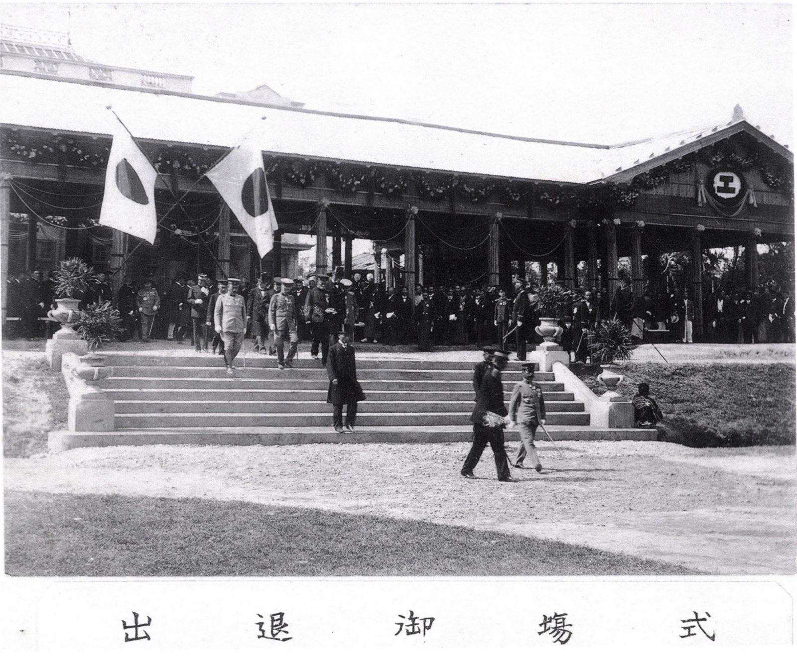 明治41(1908)年10月24日臺灣縱貫鐵路通車典禮。閑院宮載仁親王親臨,此為退席之際所拍。 出自《台中市珍貴古老照片專輯第四集》,2000年12月出版,為保留照片的純樸風味,本專輯不作多餘的贅飾,僅將徵集評選出來的古老照片翻拍並分類編排,計分:人物與服飾篇、教育篇、建物與景勝篇、市街與交通篇、生活篇等五個篇章,盡量呈現古照片的原始風貌,讓讀者得以細細玩味舊時代的生活情趣。 縱貫線通車到臺中火車站迎來了第一代火車站啟用後重要的一年,基隆到高雄長達250哩的縱貫線鐵路終於完成了最艱難的路段:豐原到臺中的鐵路接軌並通車。臺灣總督府更為此成立了「全通式委員會」,由當年的鐵道部長長谷川謹介擔任委員長,通車典禮除了慶祝全線通車外,全通式委員會還邀請閑院宮載仁親王共襄盛舉,發出將近2,000張的邀請函給日本國內外的政商名流,也藉機將臺中公園重新整建一番,興建了不少公共設施,湖心亭便是其一。更多相關資訊詳見《台中市史》、《驛動軌跡-臺中火車站的古往今來》、《日月湖心-臺中公園的今昔》。