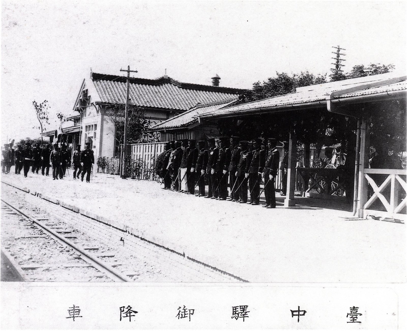 明治41(1908)年10月24日,日本皇室閑院宮載仁親王抵臺中火車站,官員列隊歡迎之情形。 出自《台中市珍貴古老照片專輯第四集》,2000年12月出版,為保留照片的純樸風味,本專輯不作多餘的贅飾,僅將徵集評選出來的古老照片翻拍並分類編排,計分:人物與服飾篇、教育篇、建物與景勝篇、市街與交通篇、生活篇等五個篇章,盡量呈現古照片的原始風貌,讓讀者得以細細玩味舊時代的生活情趣。 縱貫線通車到臺中火車站迎來了第一代火車站啟用後重要的一年,基隆到高雄長達250哩的縱貫線鐵路終於完成了最艱難的路段:豐原到臺中的鐵路接軌並通車。臺灣總督府更為此成立了「全通式委員會」,由當年的鐵道部長長谷川謹介擔任委員長,通車典禮除了慶祝全線通車外,全通式委員會還邀請閑院宮載仁親王共襄盛舉,發出將近2,000張的邀請函給日本國內外的政商名流,也藉機將臺中公園重新整建一番,興建了不少公共設施,湖心亭便是其一。更多相關資訊詳見《台中市史》、《驛動軌跡臺中火車站的古往今來》、《日月湖心-臺中公園的今昔》。