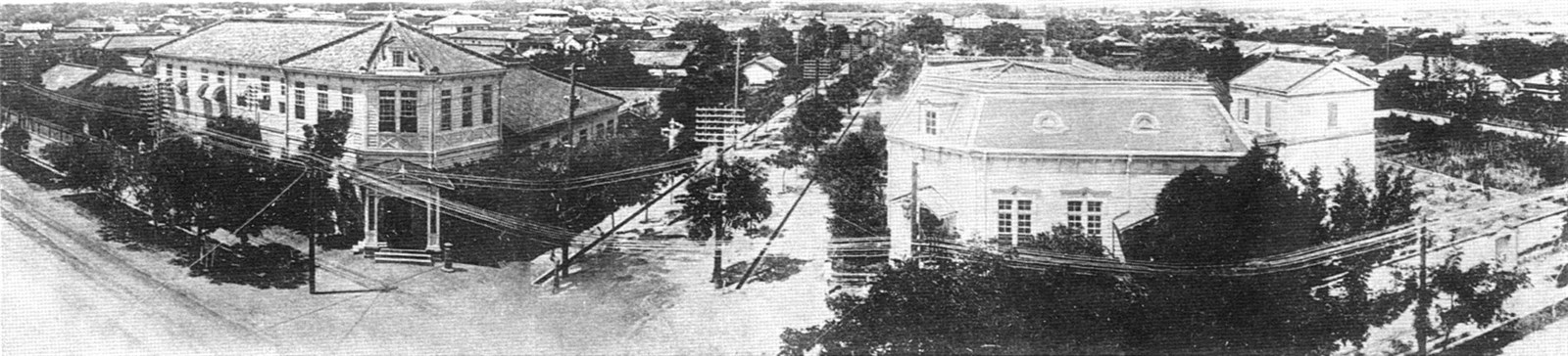 臺中市街鳥瞰,具優美文化城的風雅。日本大正6(1917)年攝影。 1901年,台中縣「市區改正計劃」發布實施,建構出棋盤式街道,並在市區河道上興建木造橋樑,隨後又改為鋼筋水泥結構。1926年,台中市實施地號調整及改稱町名,由東至西的道路以綠川上的橋名稱做為路名,從北向南為干城橋通(成功路)、櫻橋通(台灣大道)、新盛橋通(中山路)、榮町通(民族路)、大正橋通(民權路)等。 出自《台中市珍貴古老照片專輯第三集》,1997年5月出版,為保留照片的純樸風味,臺中市政府文化局1994年起向民眾多次徵集珍貴古老照片,加以翻拍並分類編排,共分為人物與服飾、教育、建物與景勝、市街與交通、生活等,儘量呈現古照片的原始風貌,讓讀者得以細細玩味舊時代的生活情趣。