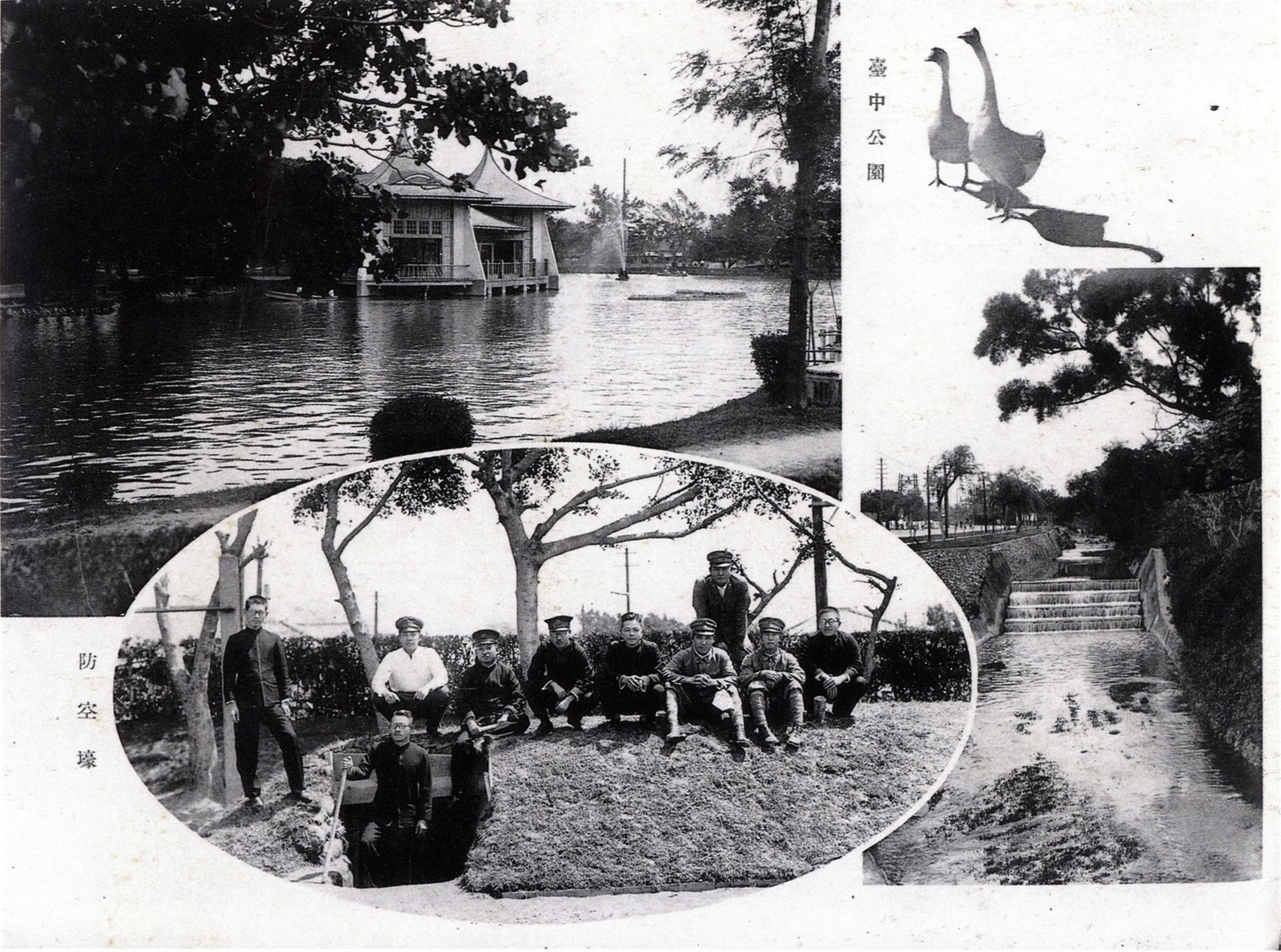 此幀照片為日治時代臺中公園的一些場景,時為戰時,左下圖為防空洞及在洞上拍照的學生。 台中公園於1903年10月28日開園,為中部地區首座配合都市計劃所興建的現代化公園,做為市民休憩使用。在開園之初,部份土地為民間捐贈,而開園經費亦是透過民間募款而來,公園總面積為26136坪,經歷代多次擴建,目前面積為32889坪。 本照片出自《台中市珍貴古老照片專輯第四集》〈建物與景勝篇〉(第177頁),2000年12月出版,為保留照片的純樸風味,本專輯不作多餘的贅飾,僅將徵集評選出來的古老照片翻拍並分類編排,計分:人物與服飾篇、教育篇、建物與景勝篇、市街與交通篇、生活篇等五個篇章,盡量呈現古照片的原始風貌,讓讀者得以細細玩味舊時代的生活情趣。