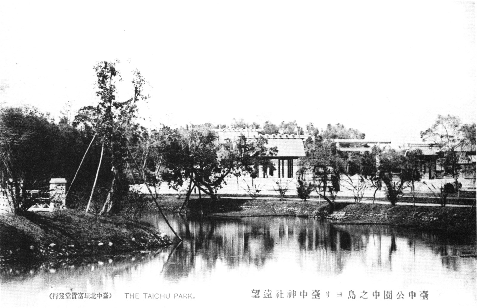 此幀是從臺中公園雙閣亭北望縣社臺中神社。此照片翻拍自日治明信片。 台中神社落成於大正元(1912) 年10月,原位於新富町(台中公園東北邊,即今台中圖書館邊),12月17日舉行鎮座祭,1913年5月29日第一代的台中神社升格為縣社。 出自《台中市珍貴古老照片專輯第二集》〈永遠的文化城〉ㄧ章(第271頁),1996年6月出版,為保留照片的純樸風味,臺中市政府文化局1994年起向民眾多次徵集珍貴古老照片。此專輯主題為「文化協會的年代」,共分為十章:臺灣文化協會滄桑、臺灣的聲音、阮是開拓者、同胞須團結、覺悟下的犧牲、願為同胞倒海傾、誰是無力者、千古風流人物、永遠的文化城、斷簡殘編。讓讀者得以細細回味舊時代的點點滴滴。
