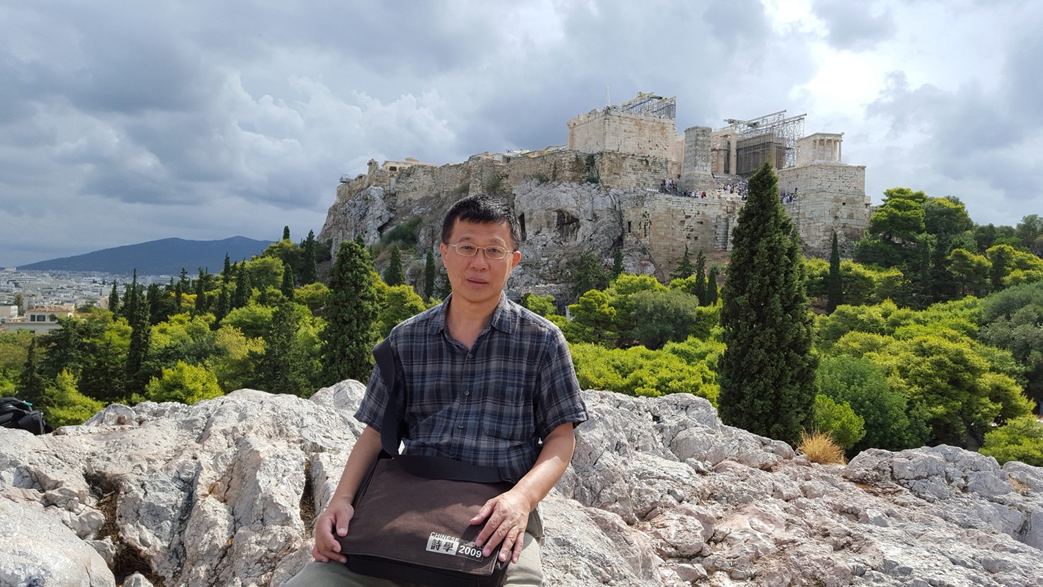 此照片中為作家陳黎。陳黎本名陳膺文,民國43年(1954)出生,畢業於國立臺灣師範大學英語系;曾任教於花崗國中和國立東華大學,是臺灣中生代重要作家。曾獲國家文藝獎、吳三連文藝獎、時報文學獎推薦獎、敘事詩首獎、新詩首獎、聯合報文學獎新詩首獎、梁實秋文學獎詩翻譯獎以及金鼎獎等,民國94年(2005)更獲選為「臺灣當代十大詩人」。其寫作類型包括詩、散文、評論和翻譯等,作品內斂又奔放,富浪漫情懷,並且充滿對土地的關懷;作品曾收錄於國、高中教科書內,同時也透過外譯,深受國際文壇的肯定,多次受邀參加國際詩歌節。
