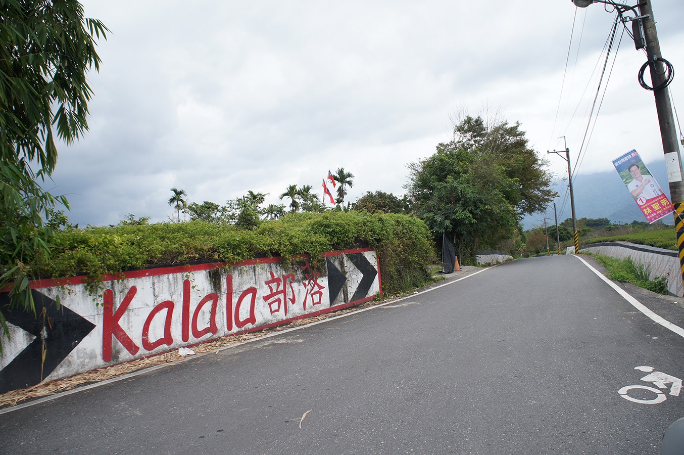 此照片中的標語牆拍攝於迦納納部落入口。Kalala部落,漢語稱做位在迦納納部落,位於花蓮縣瑞穗鄉舞鶴村,居民以阿美族居多。Kalala為秀姑巒阿美語,意指「籃子」,因為Kalala部落所在地形狀似籃子,因此而得名。根據林修澈主編的《臺灣原住民部落事典》中的說法,部落遷徙路線自cilagasun(貓公山)遷至光復鄉太巴塑某處,再陸續遷至koyo(現溫泉部落)、satokoai(石拉)、nalacolan(現電台附近),最後遷至現址。曾經因布農族的侵擾而一度廢社,至清領時期,有部分族人從外地遷徙回來。Kalala迦納部落以拔仔庄遷徙至此者居多。