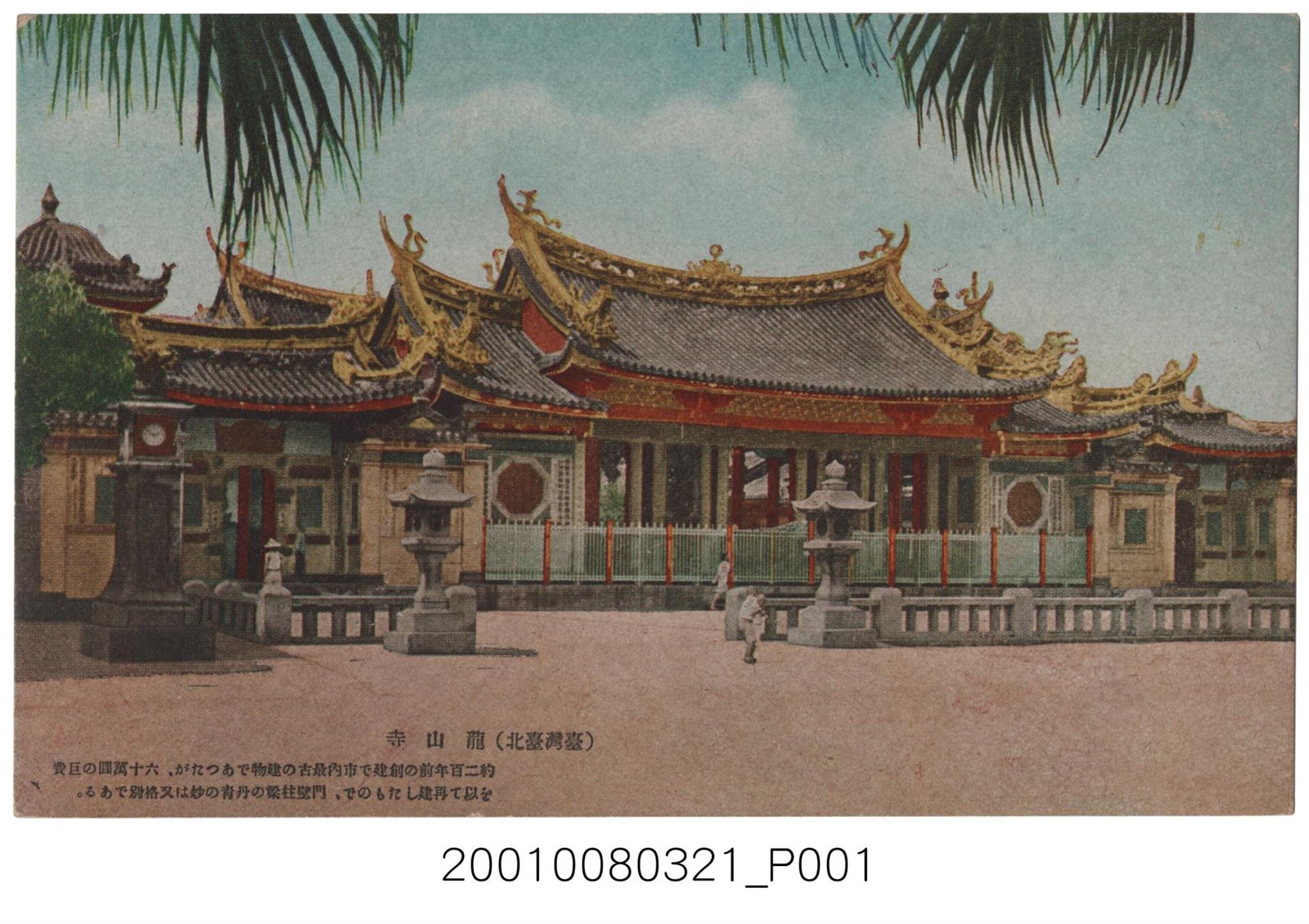 1.本物件為以艋舺龍山寺為主體的明信片,其正面為艋舺龍山寺彩色圖像,畫面中可見龍山寺之廟前廣場,有2、3人於廣場上,左下有2段文字,第1段「(臺灣臺北)龍山寺」,第2段「約二百年前の創建で市內最古の建物であつれが,六十萬圓の巨費を以て再建しれもので,門壁柱梁の丹青の妙は又格別である。」大意為200多年前建立市內最古老的建物,花費60萬圓再建,門壁上的顏料格緻特別;背面為空白明信片橫式書寫面,右上處為郵票黏貼處,右側有「郵便はかき」字樣,上方有「POST CARD」及2行字樣,由左至右為「Correspond」與「Address」。